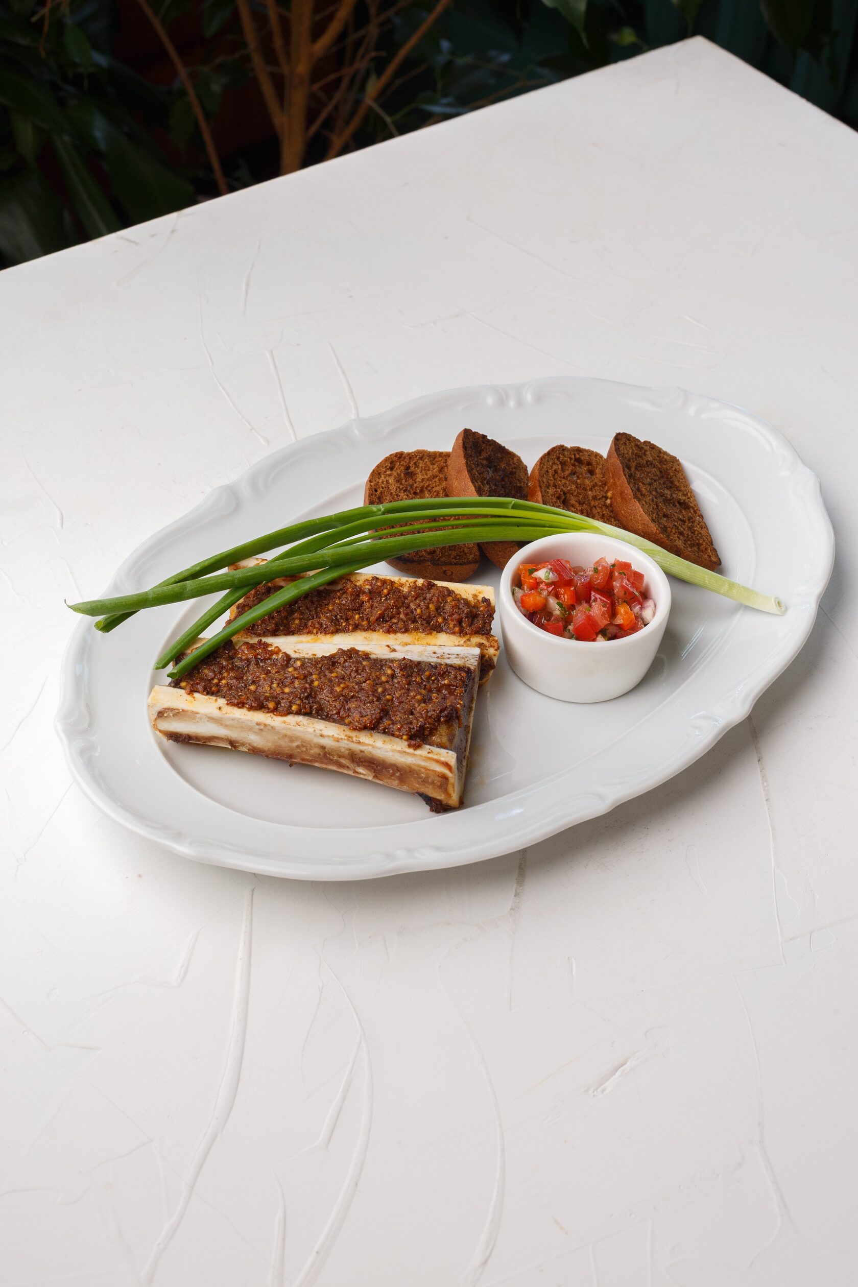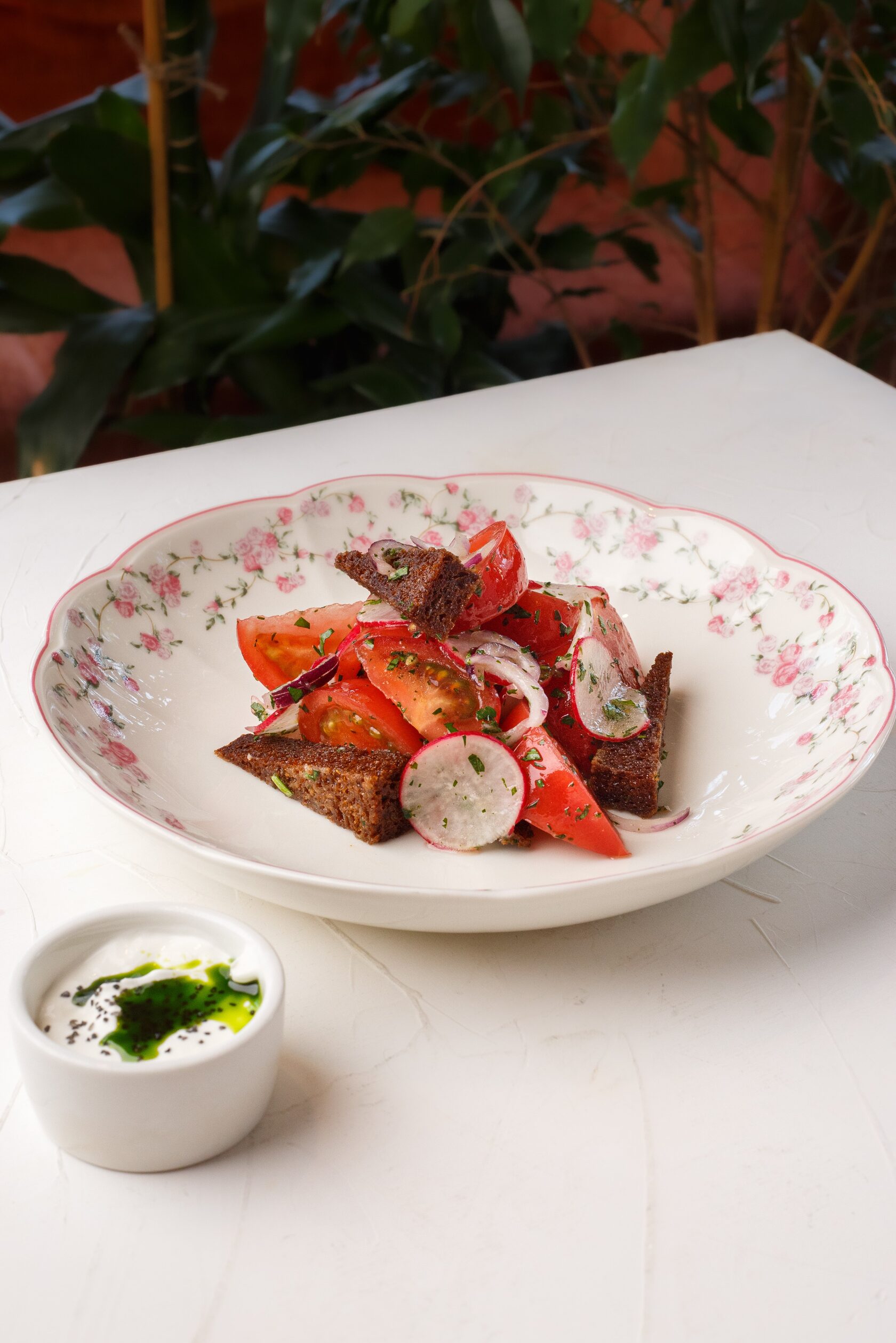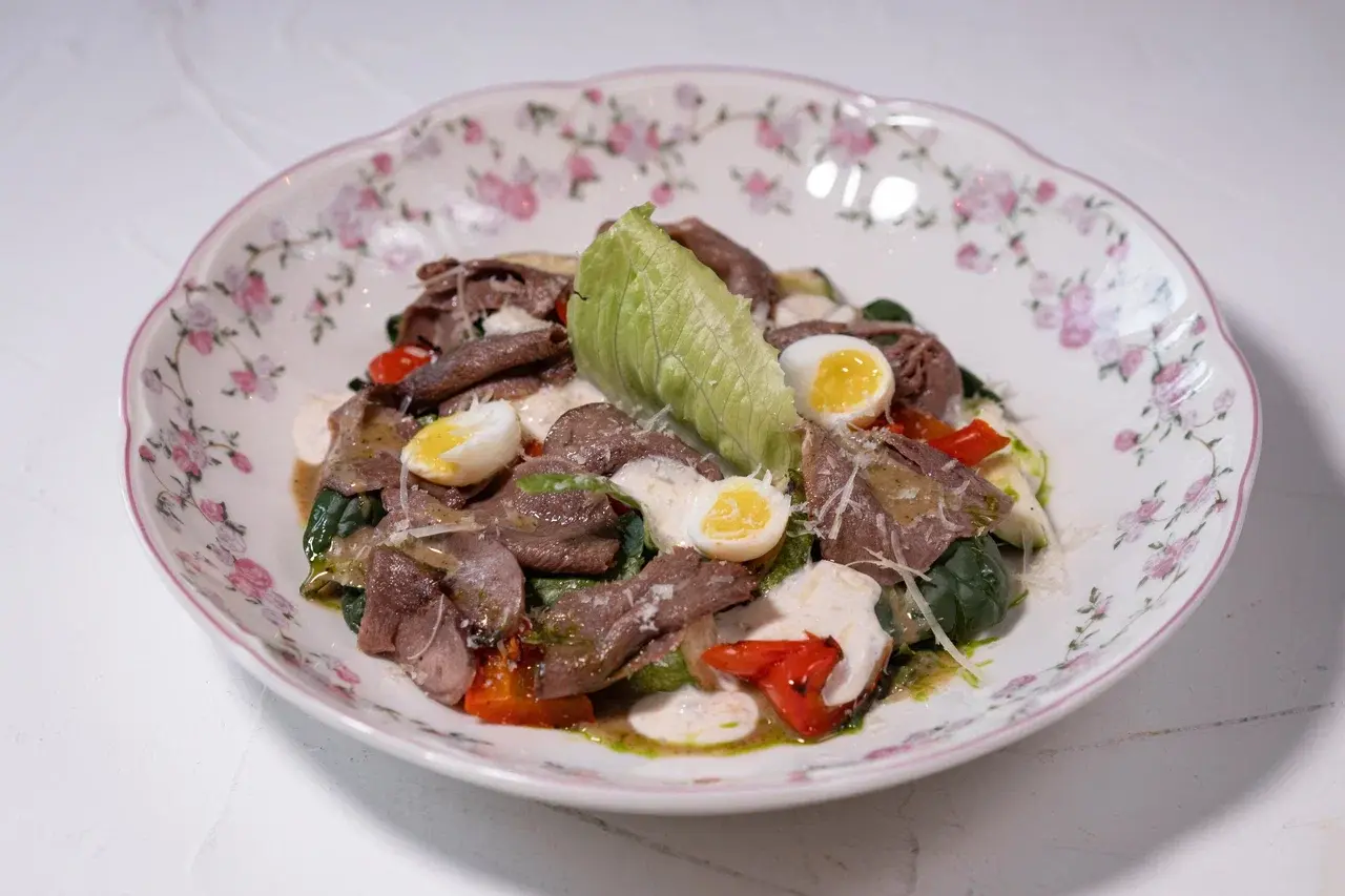 Теплый салат с запеченными овощами, говяжьим языком и трюфельным кремом