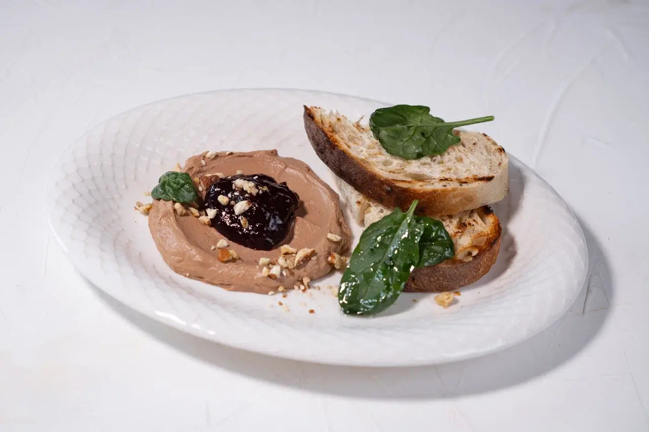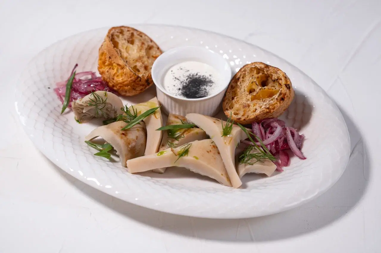 Кальмар жаренный с грибами, чесночным пюре и топинадой из оливок