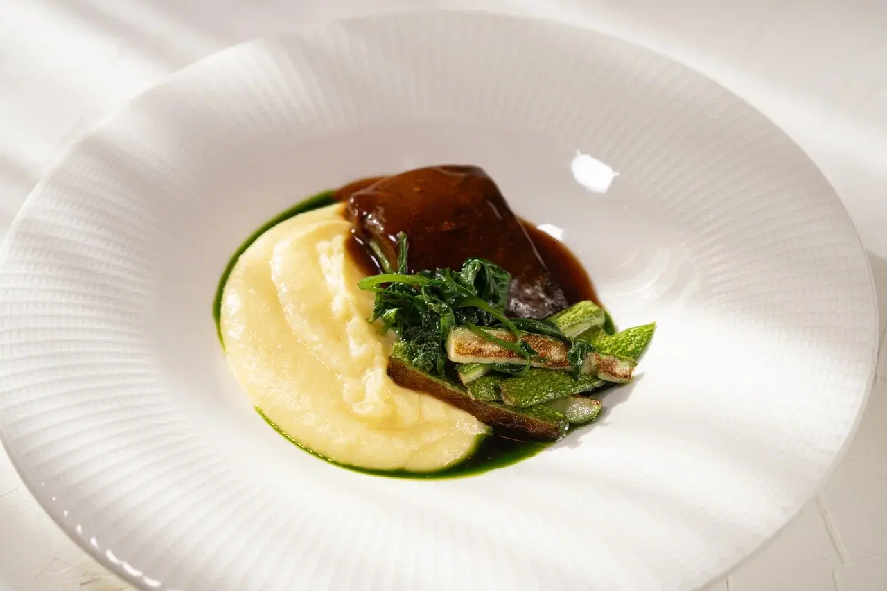 Говяжьи щечки с картофельным пюре, шпинатом и соусом демиглас