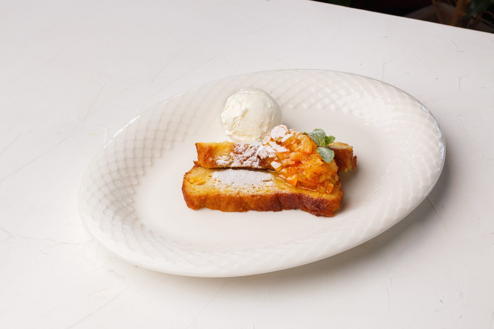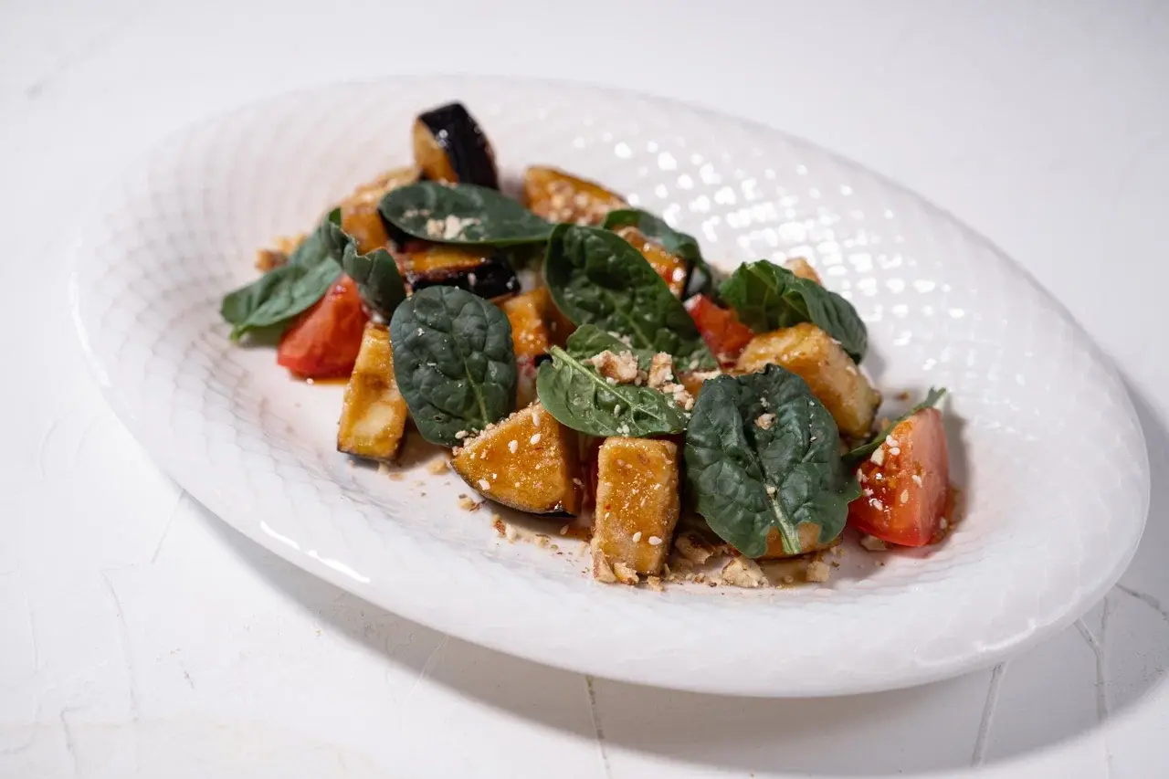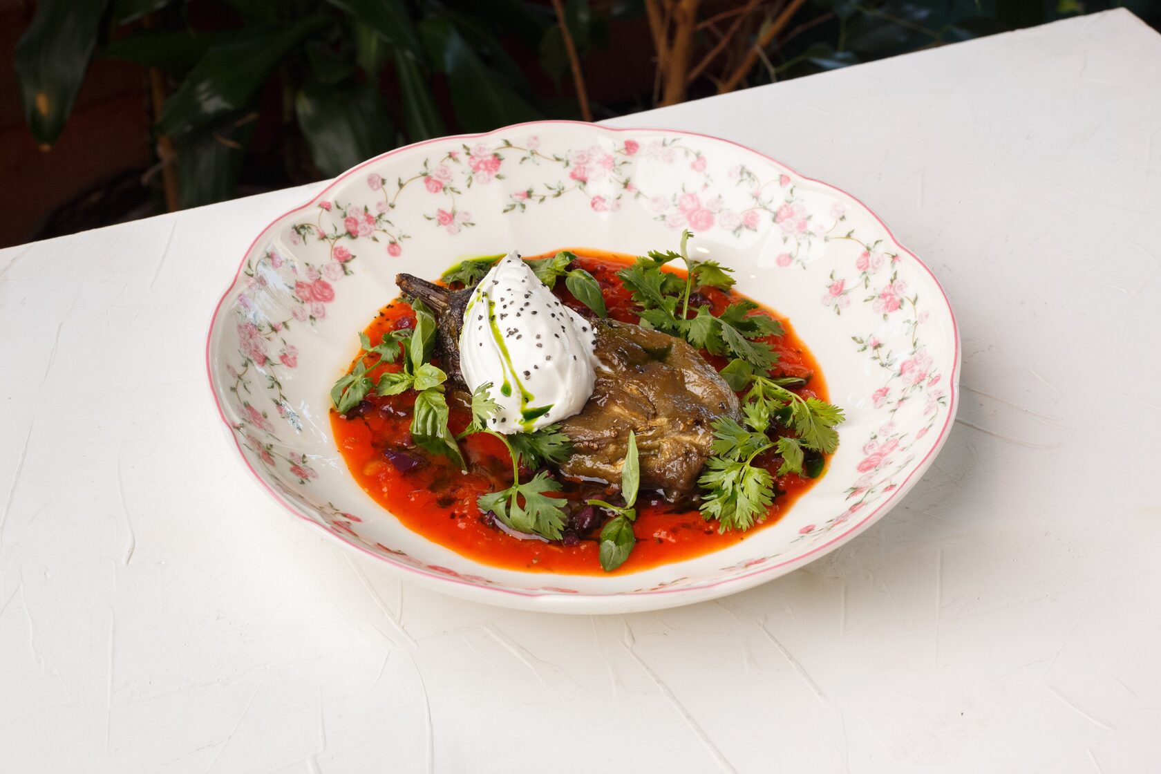Закуска из баклажана с томатами и воздушным кремом камамбер