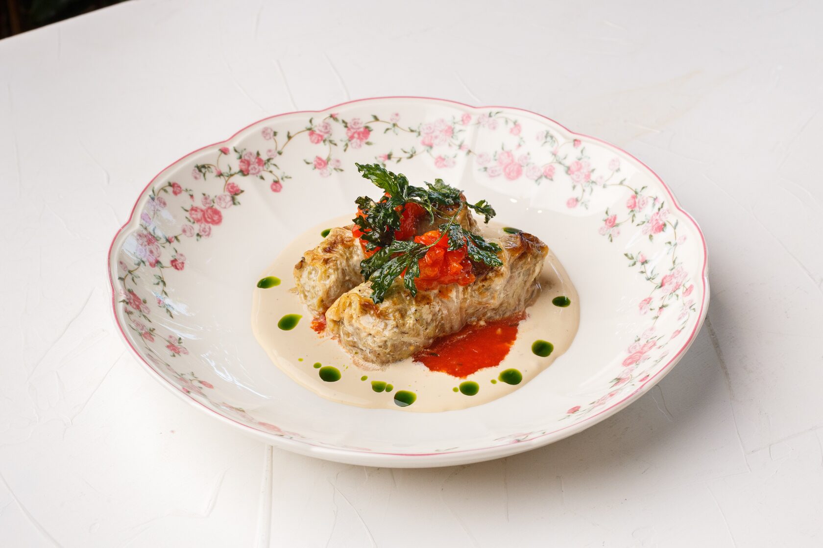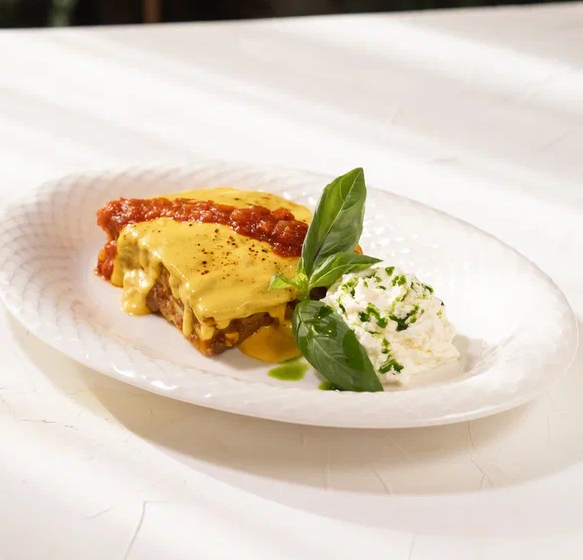 Лазанья с нежным муссом пармезан и соусом чеддер