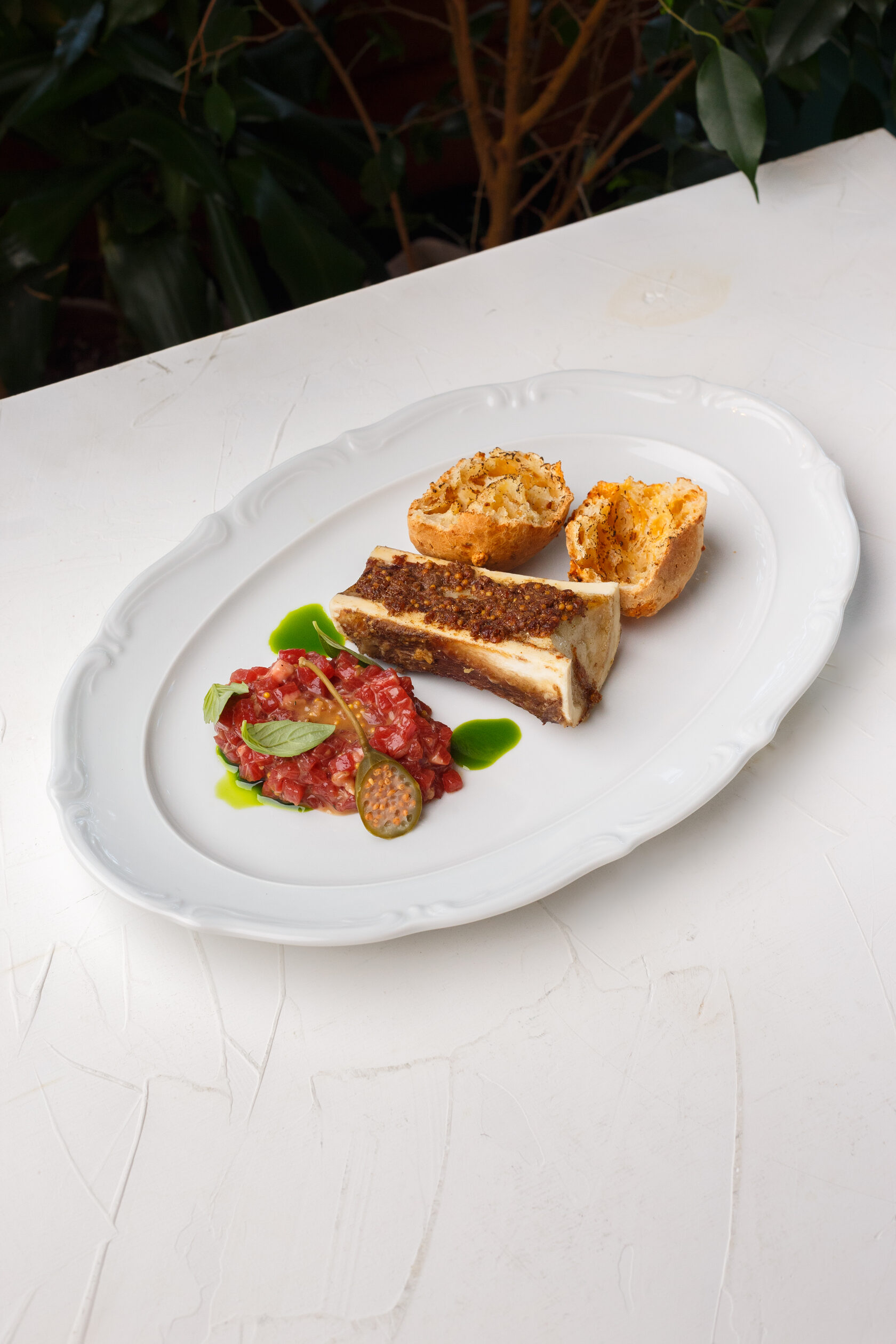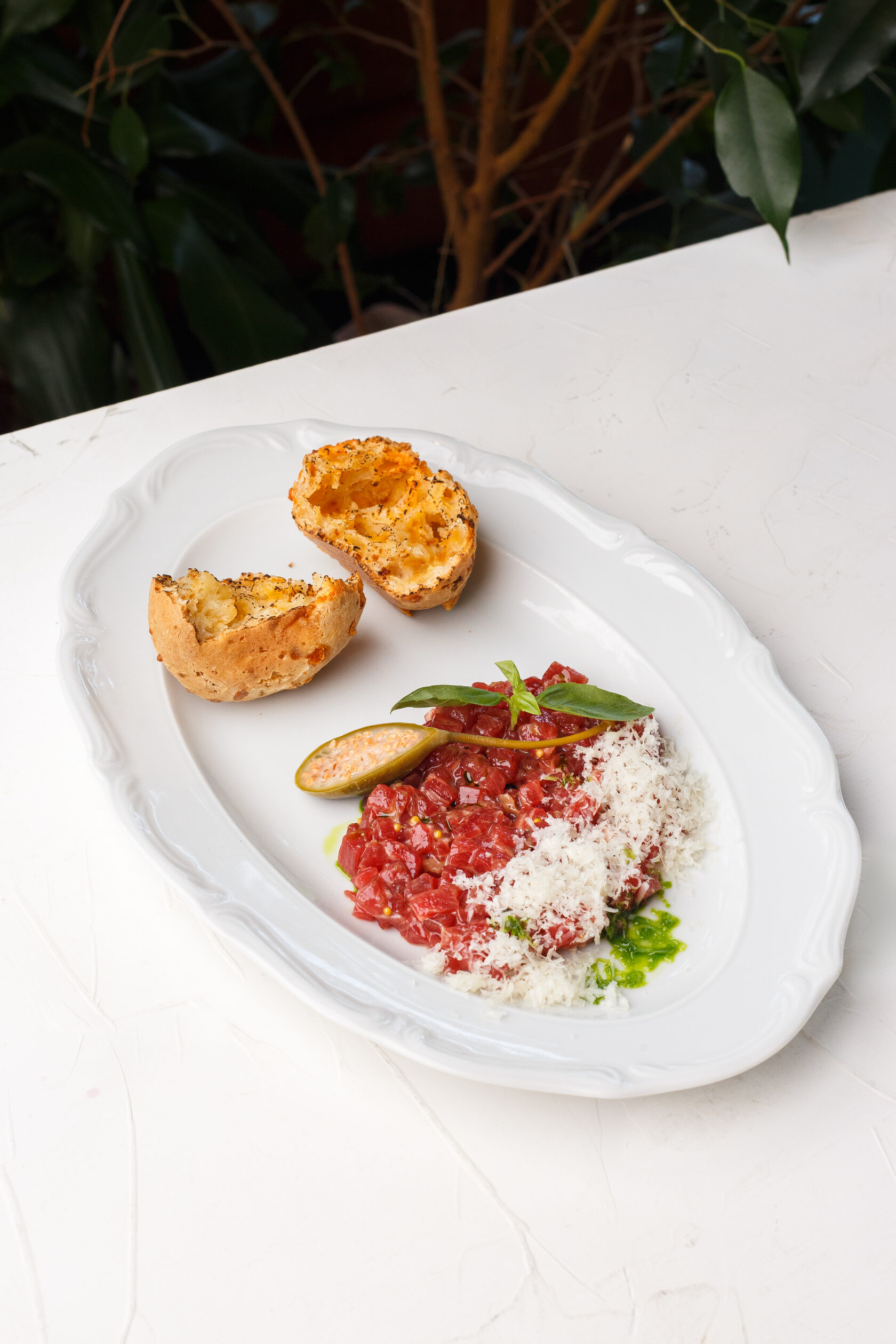 Обжаренный тунец со сливочным крем-пюре и копченым сулугуни