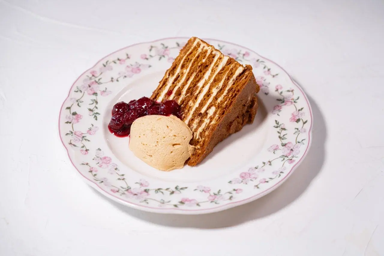 Домашний медовик со взбитой карамелью и вишневым компоте